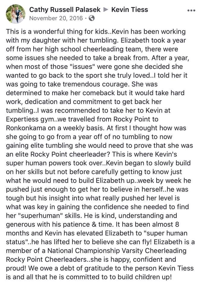 Are you a cheeleader who wants to make the squad but neeed to learn or add new tricks to your repetoire for better routines? Look no further... I bring much experience along with my Air Track and teach fun, safe tumbling progressions for groups or privately to help athletes gain strength, confidence and clean technique.